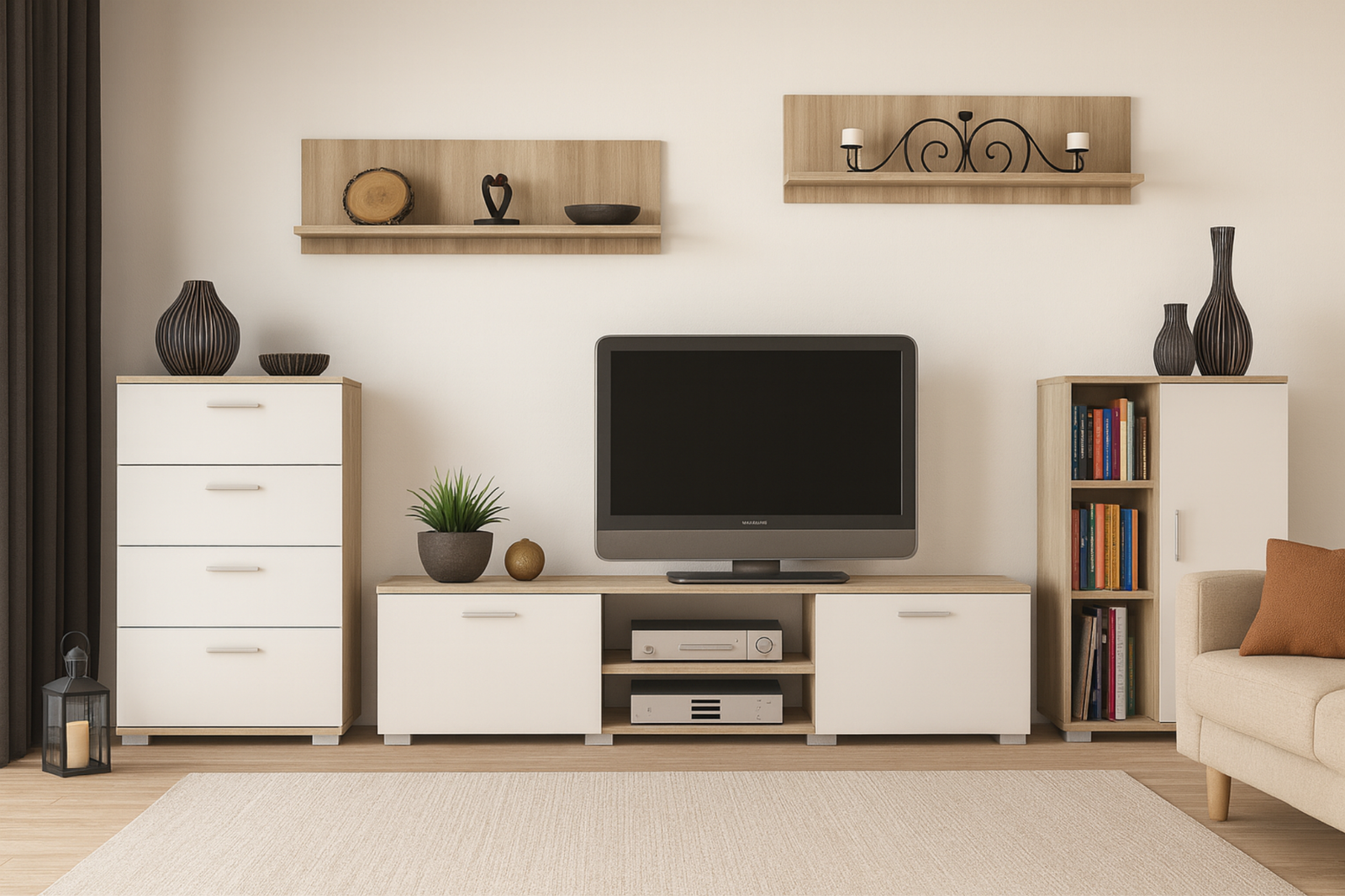 Zestaw został wykonany z trwałych i odpornych na codzienne użytkowanie materiałów. Szafka RTV, dwie komody oraz dwie półki ścienne powstały z solidnej płyty laminowanej o grubości 18 mm, która cechuje się odpornością na zarysowania i łatwością w czyszczeniu. Tylną ściankę w szafce RTV oraz komodach wykonano z wytrzymałej płyty HDF, co zwiększa stabilność konstrukcji. Wszystkie krawędzie zostały starannie oklejone obrzeżem PCV, co dodatkowo zwiększa ich trwałość i poprawia estetykę mebla. To połączenie estetyki, trwałości i wygody użytkowania.