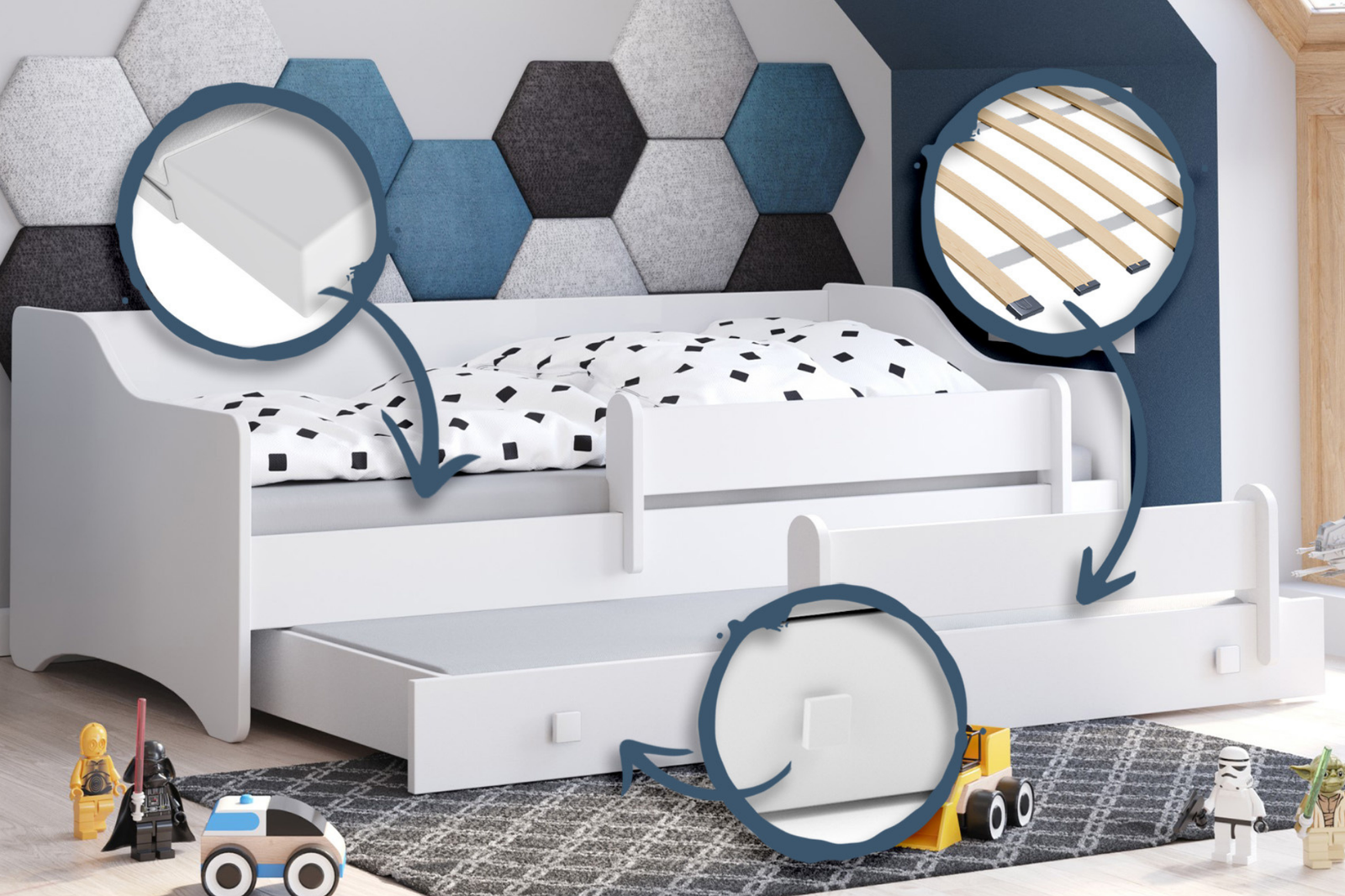 Łóżko ERYK II zostało zaprojektowane z myślą o estetyce, funkcjonalności i bezpieczeństwie. Konstrukcja powstała z wysokiej jakości płyty meblowej, co zapewnia stabilność. Delikatnie zaokrąglone krawędzie, zabezpieczone obrzeżem PCV eliminują ryzyko urazów. W zestawie znajdują się również dwie barierki zabezpieczające. Komfort wysuwania dolnej części łóżka zapewniają uchwyty w kształcie kwadratów, które dodatkowo zwiększają atrakcyjność mebla. Stelaż stworzony został z elastycznych listew brzozowych, sprężynujących w systemie FLEX, co przekłada się na jakość snu.