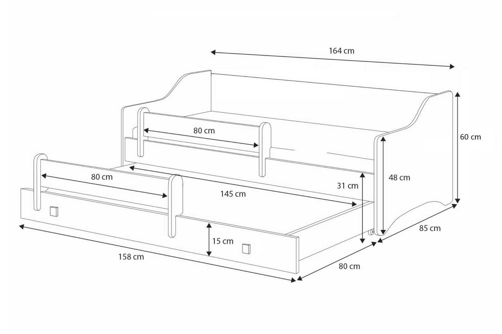 • • Łóżko górne: 164 cm x 85 cm x 60 cm