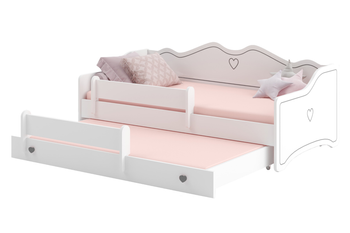Łóżko dziecięce EMMA doskonale wpasowuje się w aranżację pokoju dziewczynki. Akcenty takie jak grafika i uchwyty w serduszka nadają mu dodatkowego uroku.